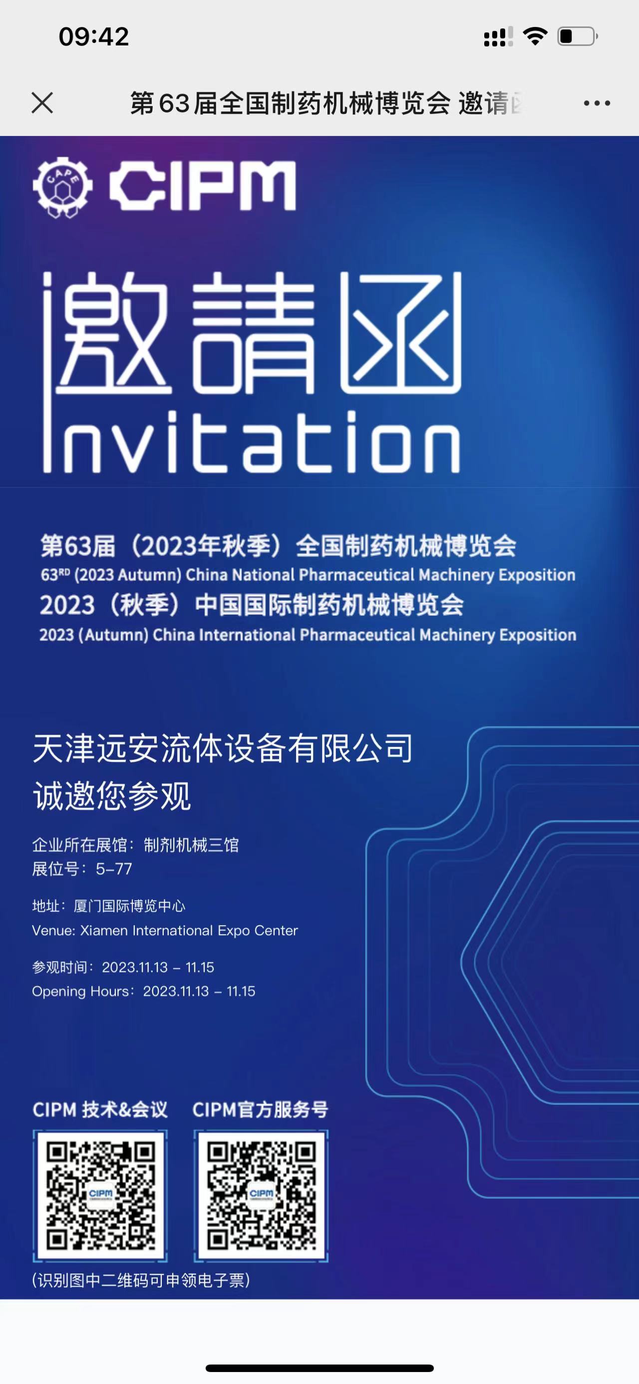 點(diǎn)擊邀請(qǐng)下載第6 3屆(2023年秋季)中國國際制藥機(jī)械博覽會(huì) CIPM廈門藥機(jī)展。天津遠(yuǎn)安流體設(shè)備有限公司誠邀您參觀。